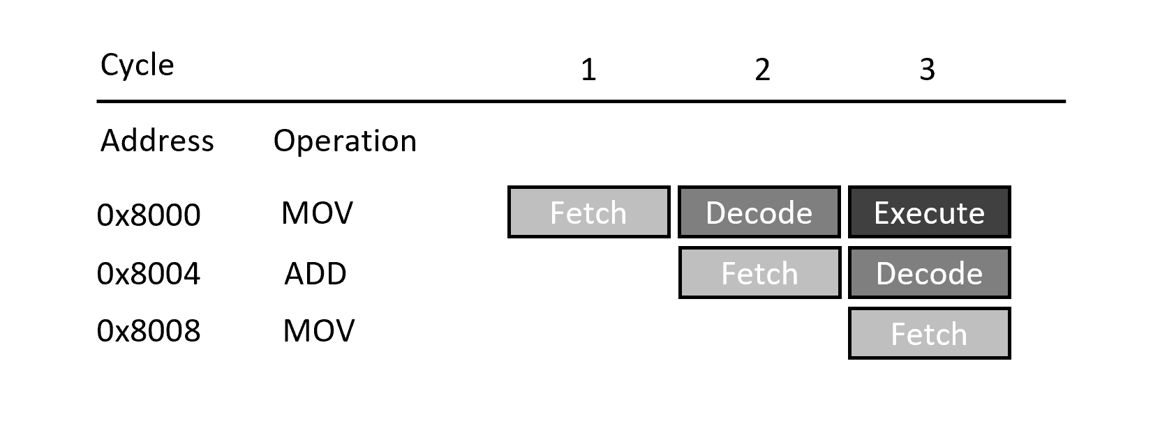 In x86 architecture, as we all know, the program counter register (actually called the instruction pointer in x86, same thing with a different name) always points to the next instruction to be executed during normal program flow (i.e. without branching). Well, this is not the case for a 32-bit ARM processor. In 32-bit ARM architecture, instead of pointing to the next intruction to be executed, the PC always points to the next instruction to be fetched. This means that the PC value of an ARM instruction is its address plus 8 due to a legacy of the three stage pipeline of the original ARM1 processor as illustrated in the picture below. We can see that when the first MOV instruction is being executed, the third MOV instruction whose address is the current PC value is being fetched.